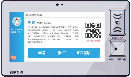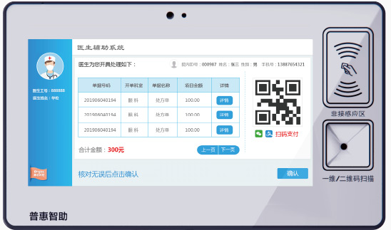 通過桌面智能終端,實現(xiàn)多方式核驗患者身份,輔助醫(yī)生與患者溝通,提高接診效率;支持多種診間支付方式,患者不出診室即可完成繳費。